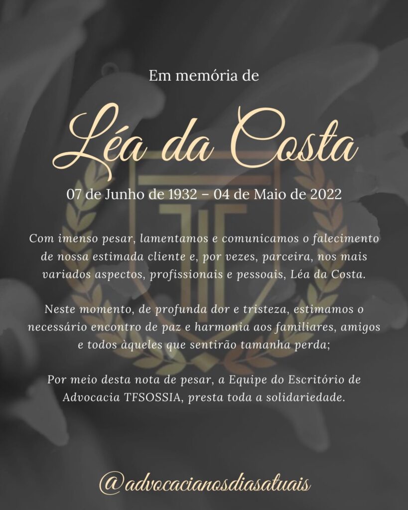 Em memória de Léa da Costa Post publicado:05/05/2022 https://esaj.tjsp.jus.br/cpopg/open.do Você também pode gostar Homenagem ao profissional Dr. Cleber Oliveira da Silva 13/09/2022 DIREITO IMOBILIÁRIO 23/08/2021 Olho no Lance: A Importância da Regularização de Imóveis no Contexto Jurídico 12/06/2024